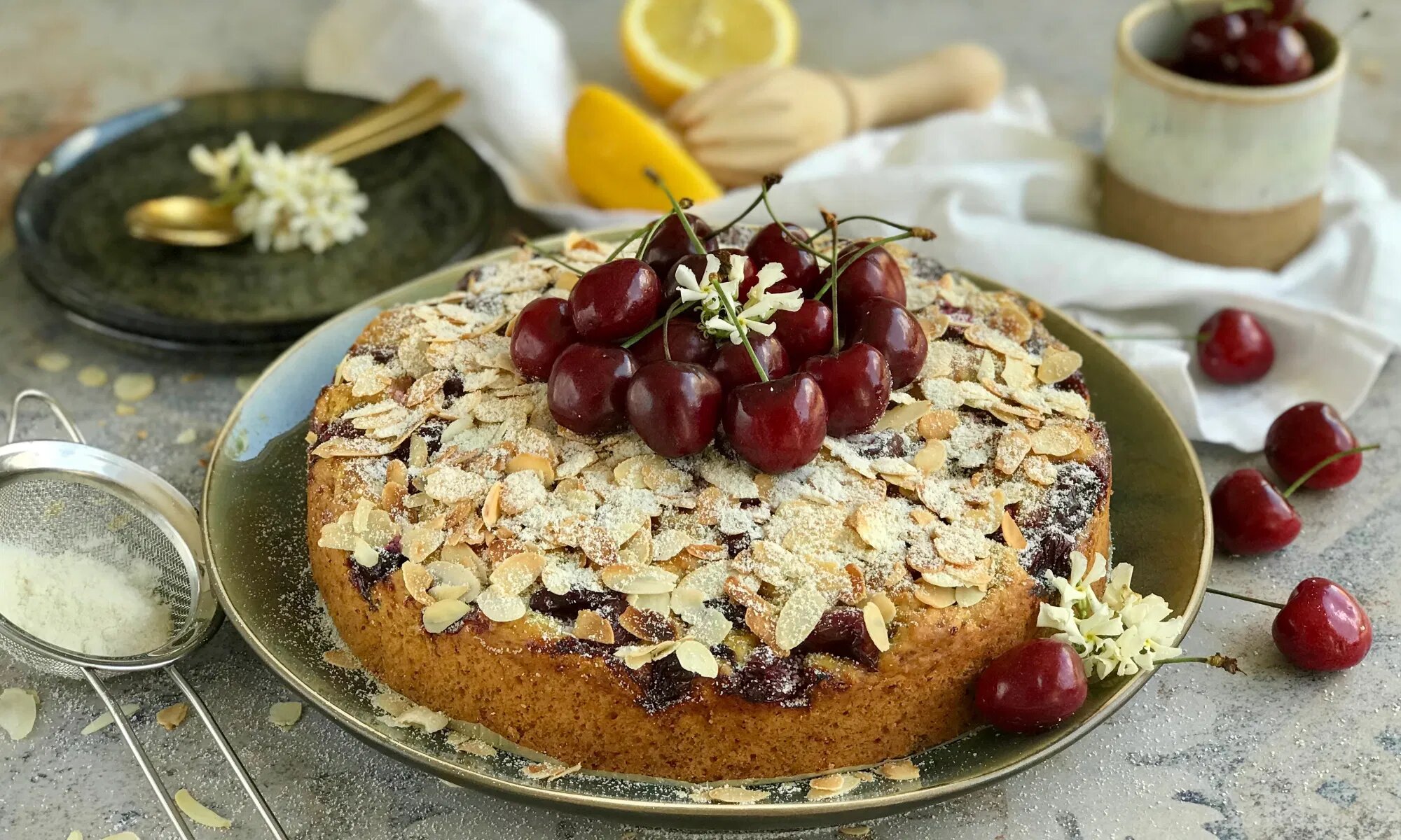 I couldn’t wait to bring some cherries from the farmer’s market to my Dutch home and, in my mind, I instantly combined the ingredients – cherries, yogurt, lemon, a lot of lemon, and almonds. It already felt so refreshing, moist, fragrant, summery. And that’s exactly how it turned out!